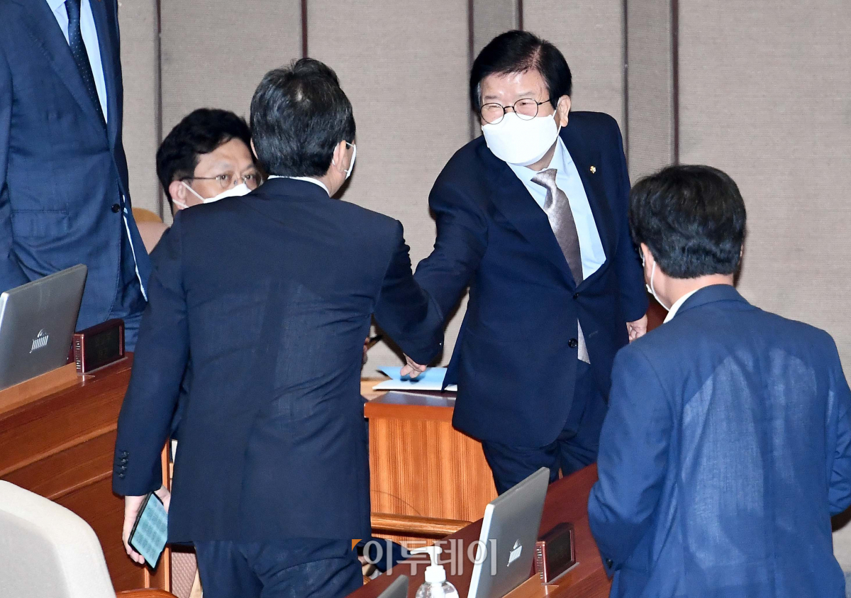 박병석(오른쪽) 국회의장과 정세균 국무총리가 20일 서울 여의도 국회에서 더불어민주당 교섭단체 대표연설을 위해 열린 본회의에서 악수하고 있다.