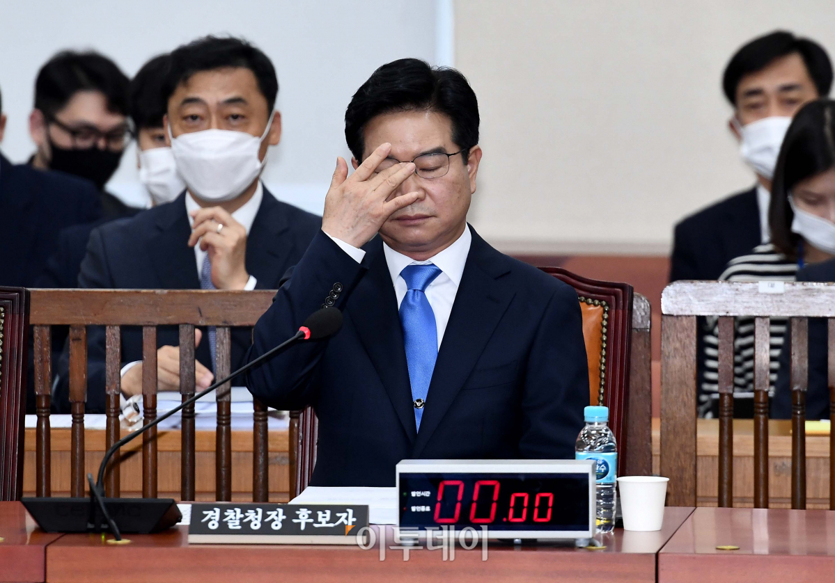 김창룡 경찰청장 후보자가 20일 서울 여의도 국회에서 열린 인사청문회에서 안경을 고쳐쓰고 있다.