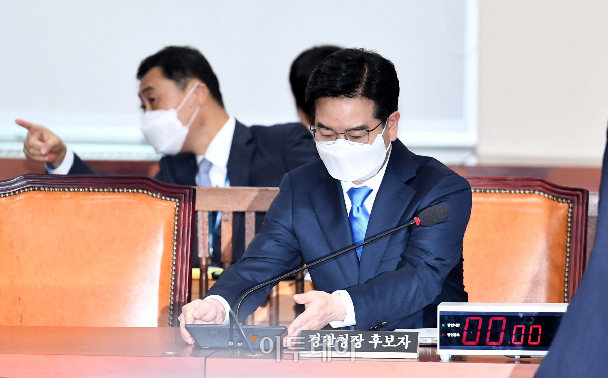 김창룡 경찰청장 후보자가 20일 서울 여의도 국회에서 열린 인사청문회를 앞두고 마이크를 정돈하고 있다.
