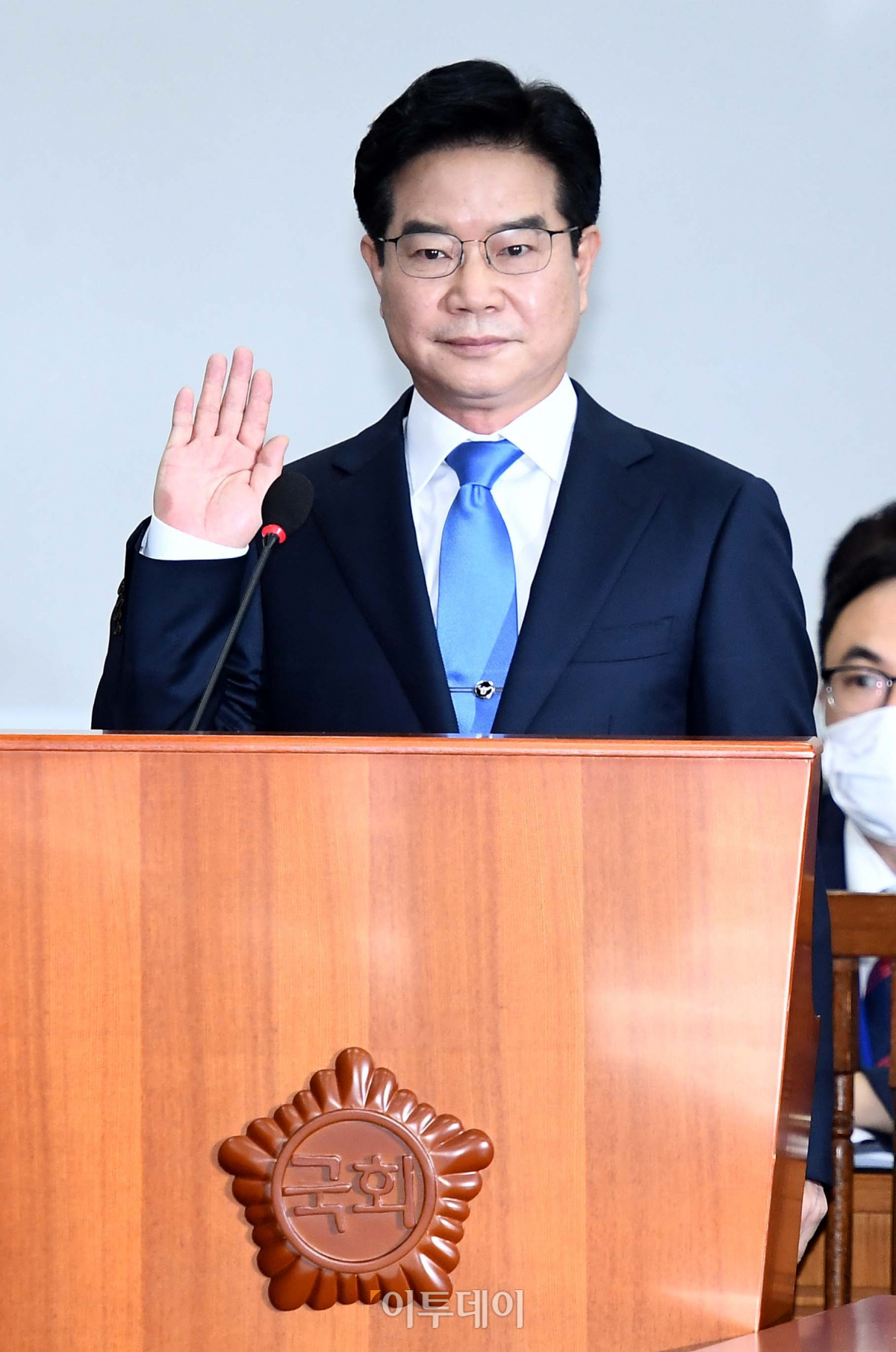 김창룡 경찰청장 후보자가 20일 서울 여의도 국회에서 열린 인사청문회에서 선서를 하고 있다.