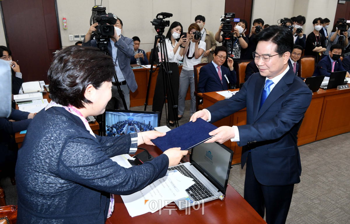김창룡 경찰청장 후보자가 20일 서울 여의도 국회에서 열린 인사청문회에서 서영교 행안위원장에게 선서문을 전달하고 있다.