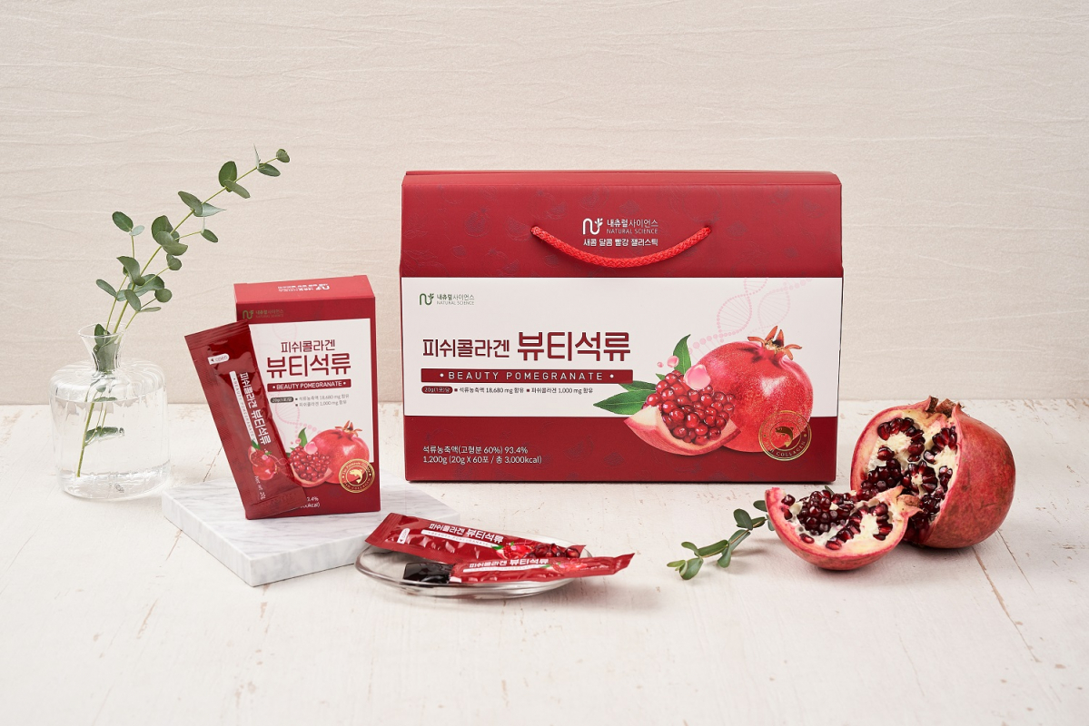 ‘피쉬콜라겐 뷰티석류’는 우리몸에 좋은 콜라겐과 석류를 적절히 배합해 젤리형태로 만든 건강식품으로 휴대가 간편해 남녀노소는 물론 여름철 약해지기 쉬운 인체 면역력 강화에 많은 도움을 준다. 영하 3도에서 24시간 저온,숙성하는 특별 제조공법으로 석류 고유의 새콤달콤한 맛을 살렸다.