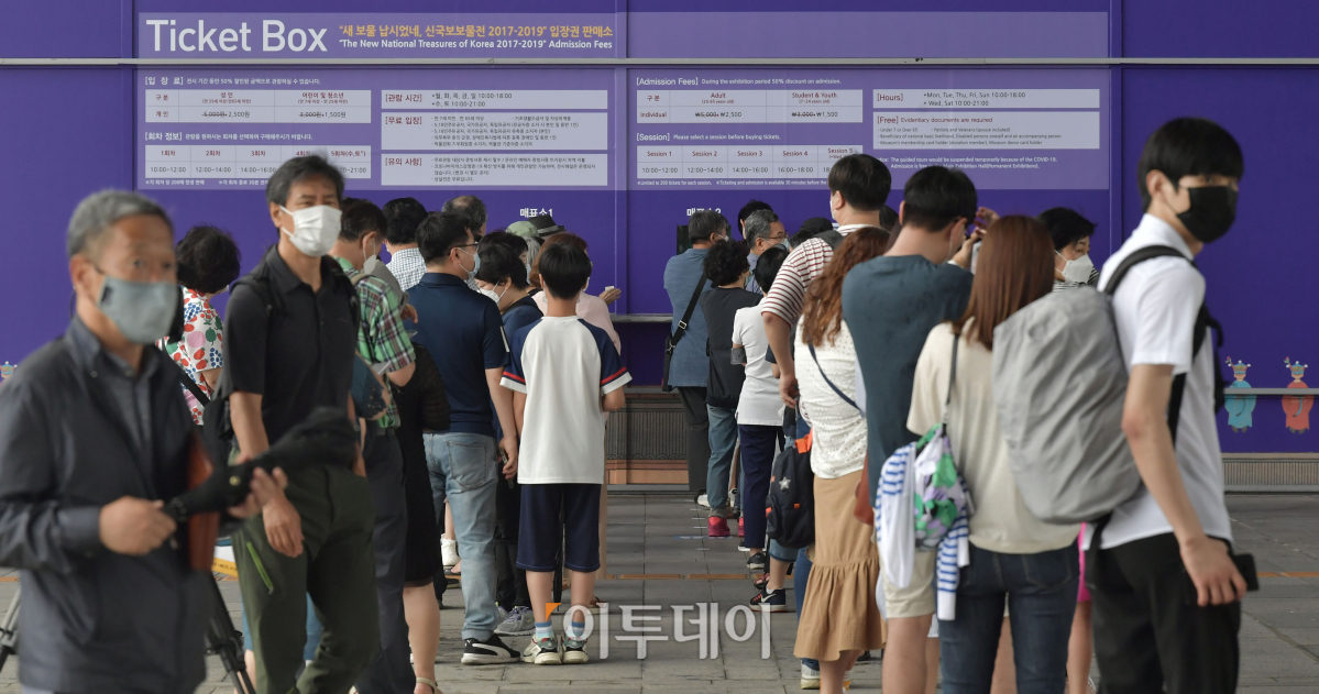 22일 서울 용산구 서빙고로 국립중앙박물관에서 시민들이 사회적 거리두기를 유지한 채 매표소에 서있다. 신종 코로나바이러스 감염증(코로나19) 확산 방지를 위해 지난 5월 29일부터 운영이 중단됐던 국립중앙박물관이 이날 재개관했다. 사회적 거리두기 1단계 실행방안대로 이용인원을 수용인원의 30퍼센트로 제한하고 전자출입 명부를 운영한다.