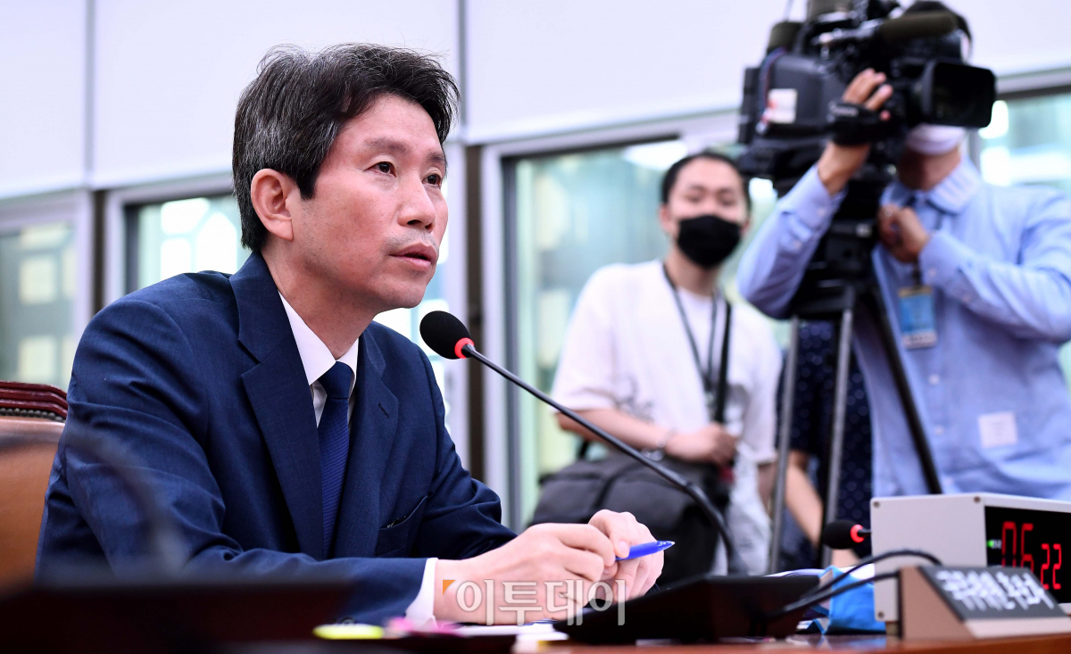 이인영 통일부 장관 후보자가 23일 서울 여의도 국회에서 열린 인사청문회에서 의원의 질의에 답하고 있다.