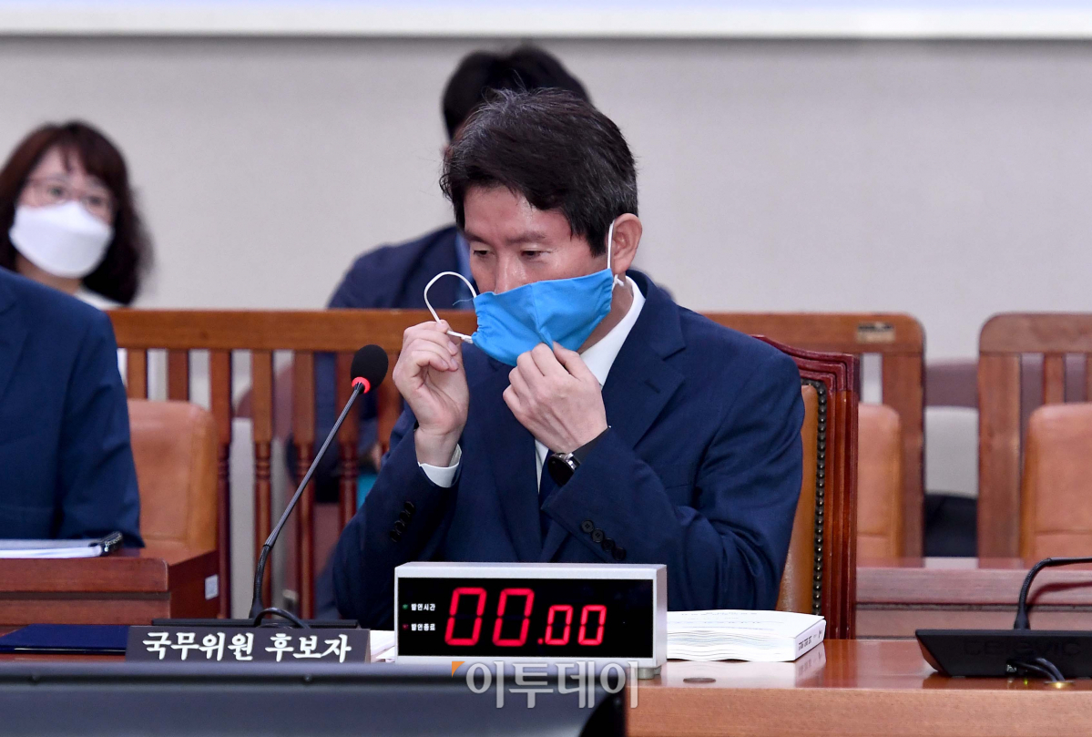 이인영 통일부 장관 후보자가 23일 서울 여의도 국회에서 열린 인사청문회에서 마스크를 벗고 있다.