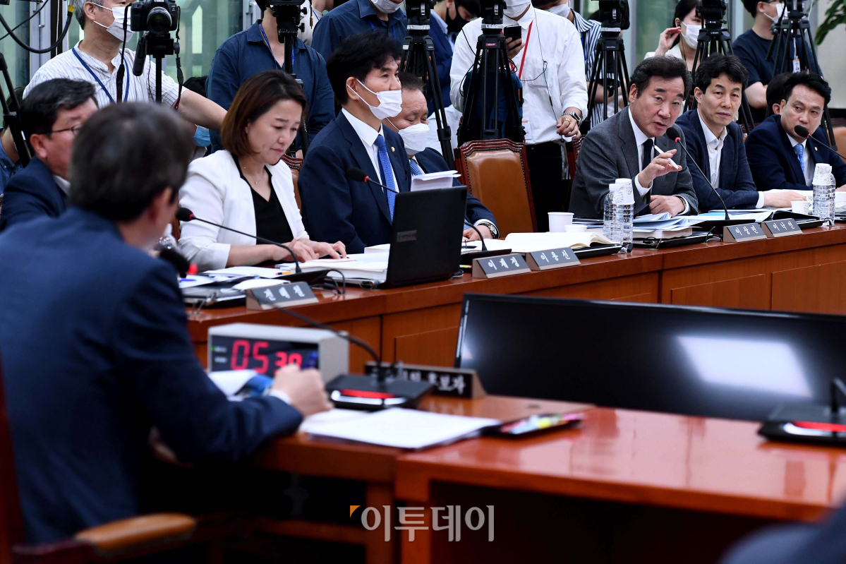 이낙연 더불어민주당 의원이 23일 서울 여의도 국회에서 열린 이인영 통일부 장관 후보자 인사청문회에서 이 후보자에게 질의하고 있다.