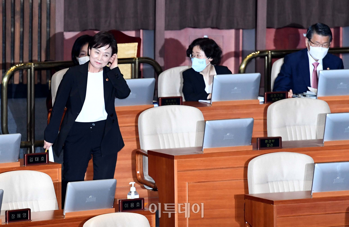 김현미 국토교통부 장관이 23일 서울 여의도 국회에서 경제분야 대정부질문을 위해 열린 본회의에서 의원의 질의에 답하기 위해 발언대로 향하고 있다.