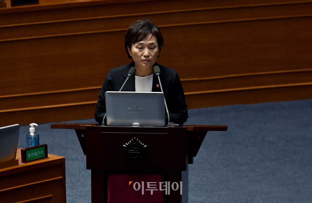 김현미 국토교통부 장관이 23일 서울 여의도 국회에서 경제분야 대정부질문을 위해 열린 본회의에서 잠시 눈을 감고 있다.