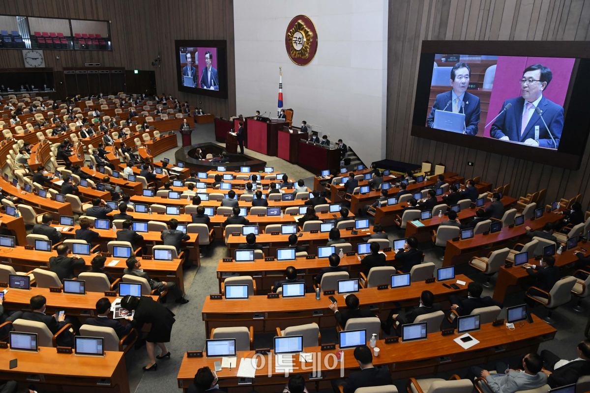 정세균 국무총리가 23일 서울 여의도 국회에서 경제분야 대정부질문을 위해 열린 본회의에서 의원의 질의에 답하고 있다.