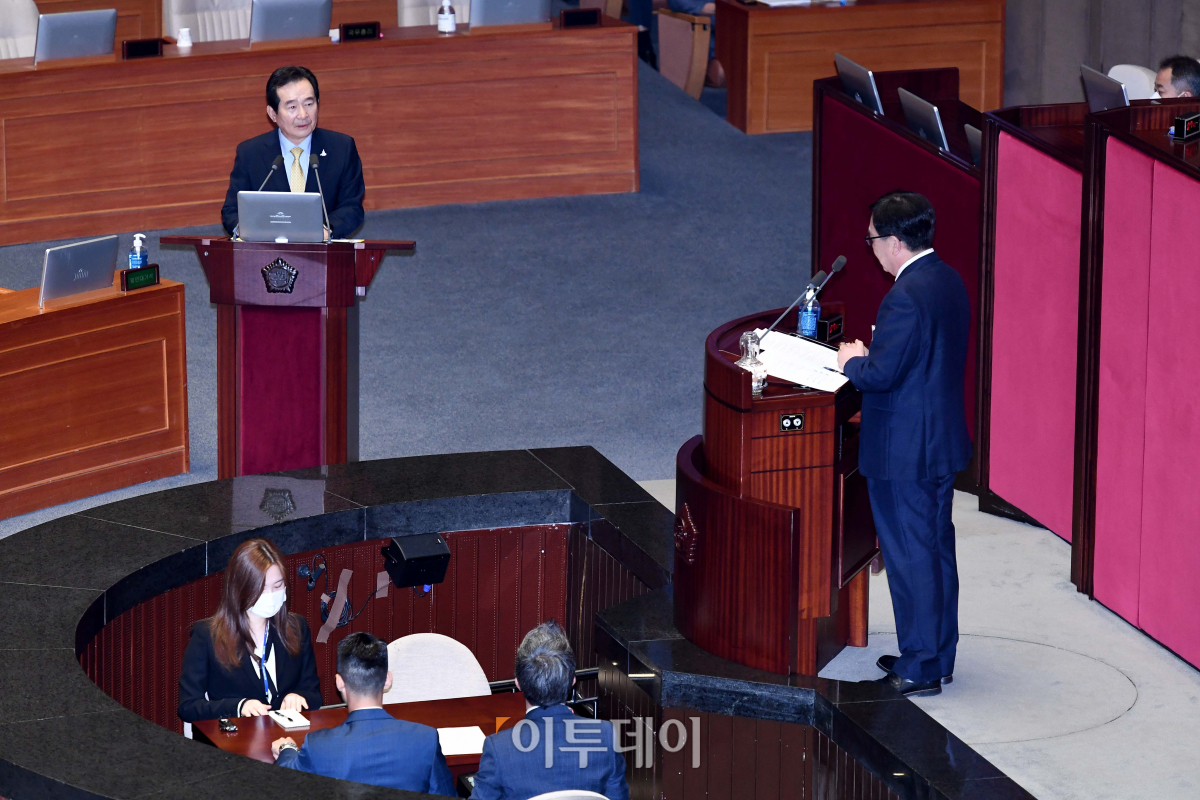 정세균 국무총리가 23일 서울 여의도 국회에서 경제분야 대정부질문을 위해 열린 본회의에서 의원의 질의에 답하고 있다.