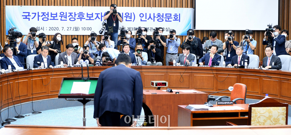 박지원 국가정보원장 후보자가 27일 서울 여의도 국회에서 열린 인사청문회에서 선서를 마친 뒤 인사하고 있다.