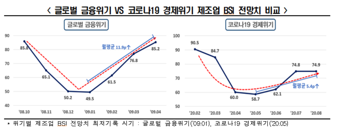 특히 한경연은 제조업 경기 전망이 V자형 회복세를 보였던 과거 위기와 달리 이번 위기에는 경기 회복이 한층 더딘 속도로 이루어지는 나이키형 회복 시나리오가 현실로 나타나고 있다고 진단했다. 글로벌 금융위기와 IMF 외환위기 당시에는 최저점 기록 후 3개월 간 제조업 전망치가 각각 월평균 11.9P, 7.3P 상승한 반면, 이번 위기 때는 같은 기간 월평균 5.4P 상승에 그친 것으로 나타났다.