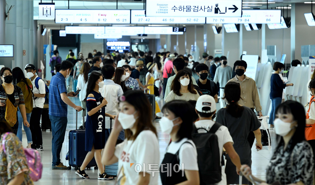 본격적인 여름 휴가철에 접어든 가운데 30일 서울 강서구 김포공항 국내선 청사가 승객들로 붐비고 있다. 항공업계는 코로나19 영향으로 해외여행을 대체할 국내여행 수요가 급증하며 휴가철 성수기인 지난 24일부터 내달 10일까지 국내공항을 이용하는 승객이 작년보다 4% 증가할 것으로 예상했다. 이 기간 항공기 운항은 총 1200여 편으로 전년 대비 13% 늘어날 것으로 전망했다.