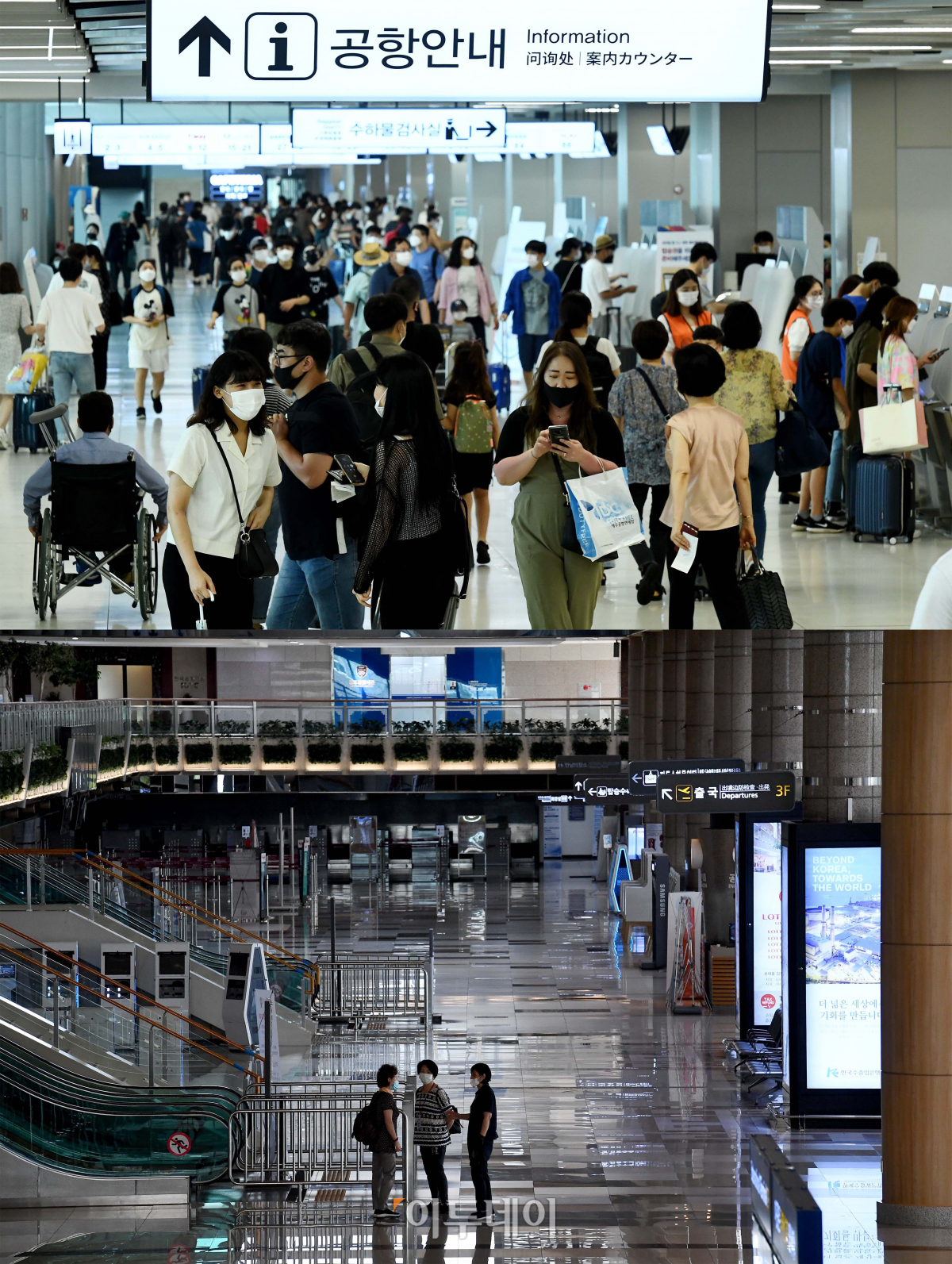 본격적인 여름 휴가철에 접어든 가운데 30일 서울 강서구 김포공항 국내선 청사가 승객들로 붐비는 모습과 운영이 중단된 국제선 청사의 썰렁한 모습이 대비된다. 항공업계는 코로나19 영향으로 해외여행을 대체할 국내여행 수요가 급증하며 휴가철 성수기인 지난 24일부터 내달 10일까지 국내공항을 이용하는 승객이 작년보다 4% 증가할 것으로 예상했다. 이 기간 항공기 운항은 총 1200여 편으로 전년 대비 13% 늘어날 것으로 전망했다.