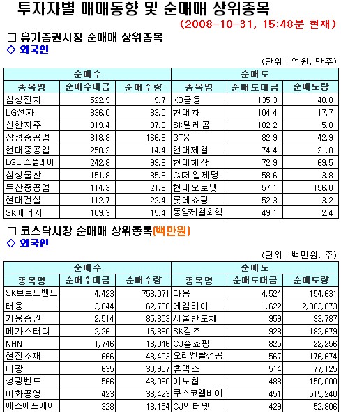 반면 KB금융(135억원)과 현대차(104억원), SK텔레콤(102억원), STX(82억원), 현대제철(74억원), 현대해상(72억원), CJ제일제당(58억원), 현대오토넷(57억원) 등을 팔았으나 순매도 규모는 크게 줄었다.