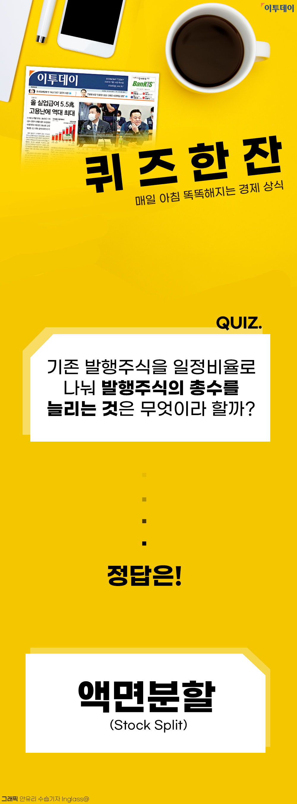 '퀴즈한잔'은 매일 한 문제씩 이투데이와 함께하는 경제 상식 퀴즈입니다! 매일 아침 커피 한 잔을 마시듯 퀴즈를 풀며 경제 상식을 키워나가세요!