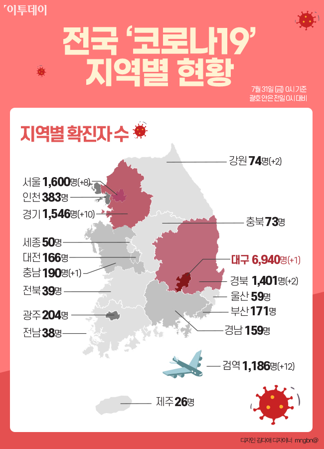 이로써 전국 시·도별 '코로나19' 확진자 수는 △대구 6940명 △서울 1600명으로 가장 많은 비중을 차지했다. 이어 △경기 1546명 △경북 1401명 △검역소 1186명 △인천 383명 △광주 204명 △충남 190명 △부산 171명 △대전 166명 △경남 159명 △강원 74명 △충북 73명 △울산 59명 △세종 50명 △전북 39명 △전남 38명 △제주 26명 순으로 나타났다.