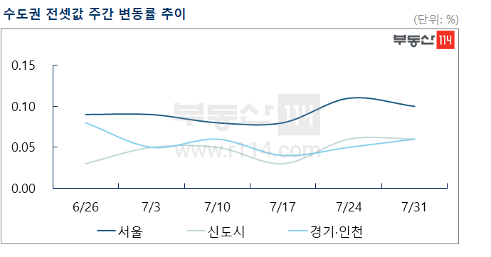 경기ㆍ인천 지역 아파트값은 신도시 지역은 0.06%, 다른 시ㆍ군은 0.09% 올랐다. 전세시장과 비슷하게 광명시(0.30%)와 하남시(0.24%), 남양주시(0.21%) 등이 아파트값 상승을 주도했다.