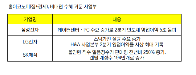 2분기는 코로나19 직격탄을 맞을 것이란 전망이 산업계 안팎에서 나왔지만, 홈이코노미(집+경제), 비대면(언택트) 수요와 관련된 일부 사업부는 가파른 상승세를 보이며 '의문의 1승'을 챙겼다는 평가다.