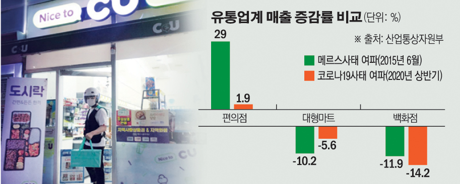 이는 2015년 메르스(MERS·중동 호흡기 증후군) 사태 때와 비슷한 양상이다. 당시 대형마트와 백화점 매출은 각각 10%씩 떨어졌지만, 편의점은 29.0% 치솟은 바 있다. 편의점이 위기에 강하다는 점이 증명됐다는 평가다.