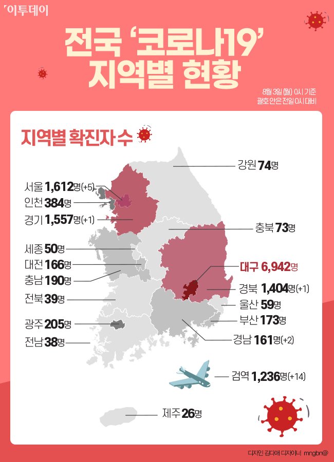 이로써 전국 시·도별 '코로나19' 확진자 수는 △대구 6942명 △서울 1612명으로 가장 많은 비중을 차지했다. 이어 △경기 1557명 △경북 1404명 △검역소 1236명 △인천 384명 △광주 205명 △충남 190명 △부산 173명 △대전 166명 △경남 161명 △강원 74명 △충북 73명 △울산 59명 △세종 50명 △전북 39명 △전남 38명 △제주 26명 순으로 나타났다.