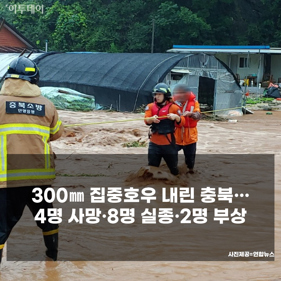 충청북도 재난안전대책본부는 1∼2일 내린 집중호우로 3일 오전 7시 기준 도내에서 4명이 숨지고 8명이 실종됐다고 밝혔습니다.