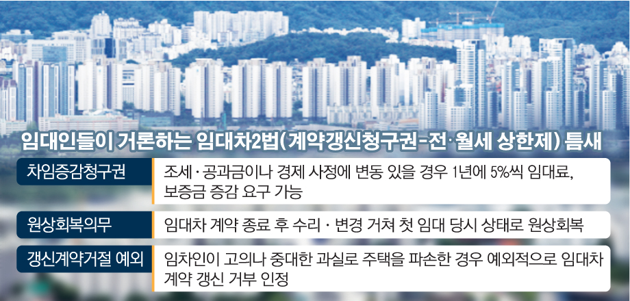 임대인들은 계약 갱신 요건도 꼼꼼히 들여다보고 있다. 임대차보호법은 임차인이 임대료를 연체하거나 주택을 고의나 중대한 과실로 파손하는 경우엔 계약 갱신을 거부할 수 있도록 조건을 규정하고 있다. 임대인들은 앞으로는 외국처럼 못 자국이나 문틀 흠집도 유책 사유로 잡아내겠다고 벼르고 있다. 계약 갱신 거부 요건엔 해당이 안 되더라도 민법이 규정하는 '원상 회복 의무'를 엄격히 적용해 수리비를 톡톡히 받아내겠다고도 입을 모은다.