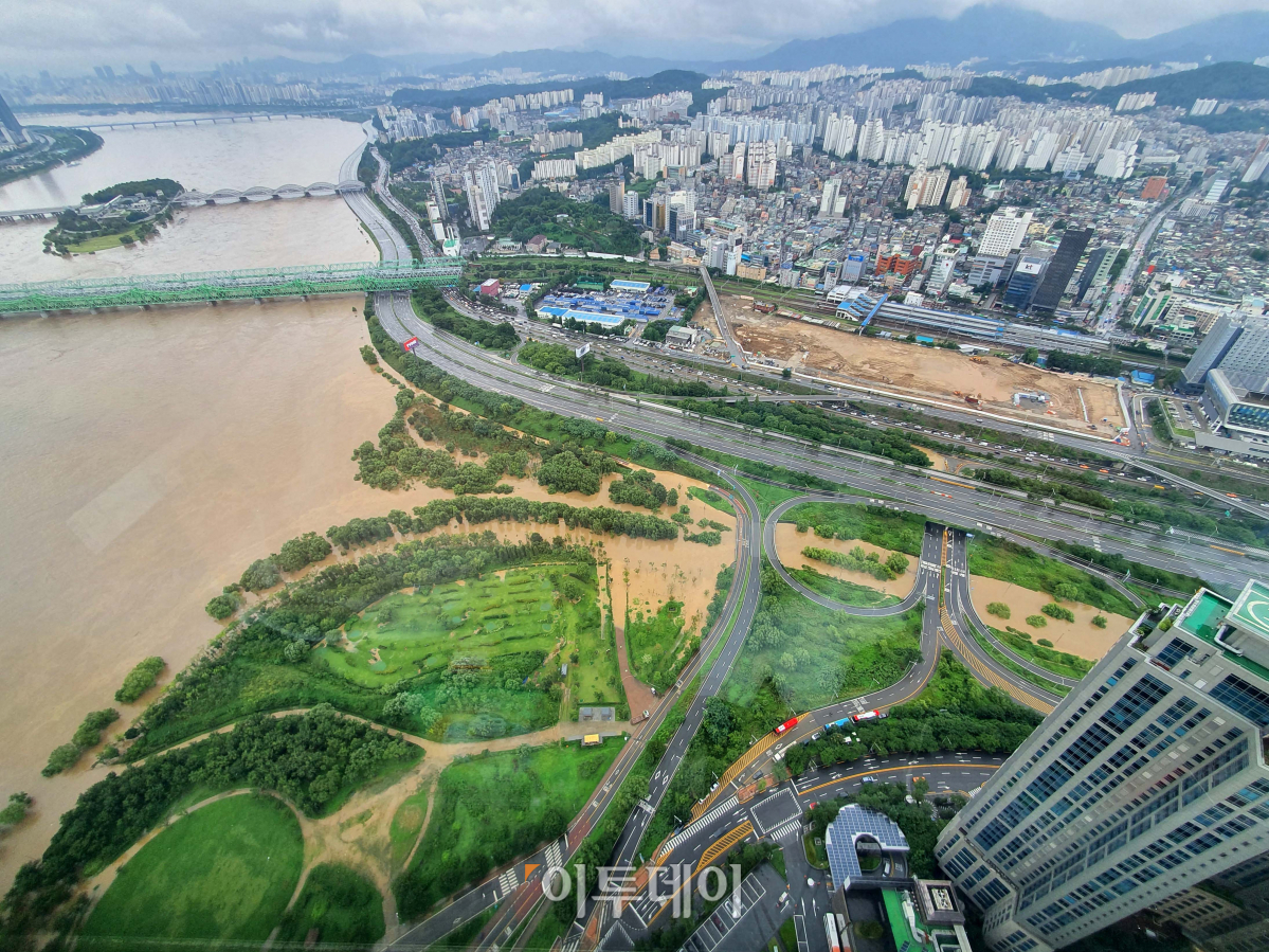 중부지방의 집중호우로 3일 올림픽대로와 서울 동부간선도로의 일부 구간 차량 진출입이 통제됐다. 이날 서울 여의도 63빌딩에서 바라본 올림픽대로의 통행이 통제되고 있다.