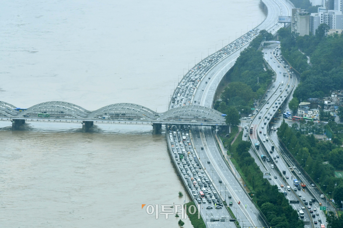 중부지방의 집중호우로 3일 올림픽대로와 서울 동부간선도로의 일부 구간 차량 진출입이 통제됐다. 이날 서울 여의도 63빌딩에서 바라본 올림픽대로의 통행이 통제되고 있다.
