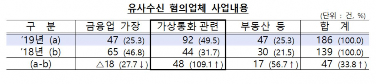 유사수신 혐의업체 중 가상통화 관련 업체의 비중이 49.5%(92개사)로 가장 높았다. 이는 전년 48개사와 비교하면 109.1% 폭증했다. 합법적 금융회사 가장 업체 25.3%, 부동산 및 기타사업 관련 업체 25.3%의 비중을 차지했다.