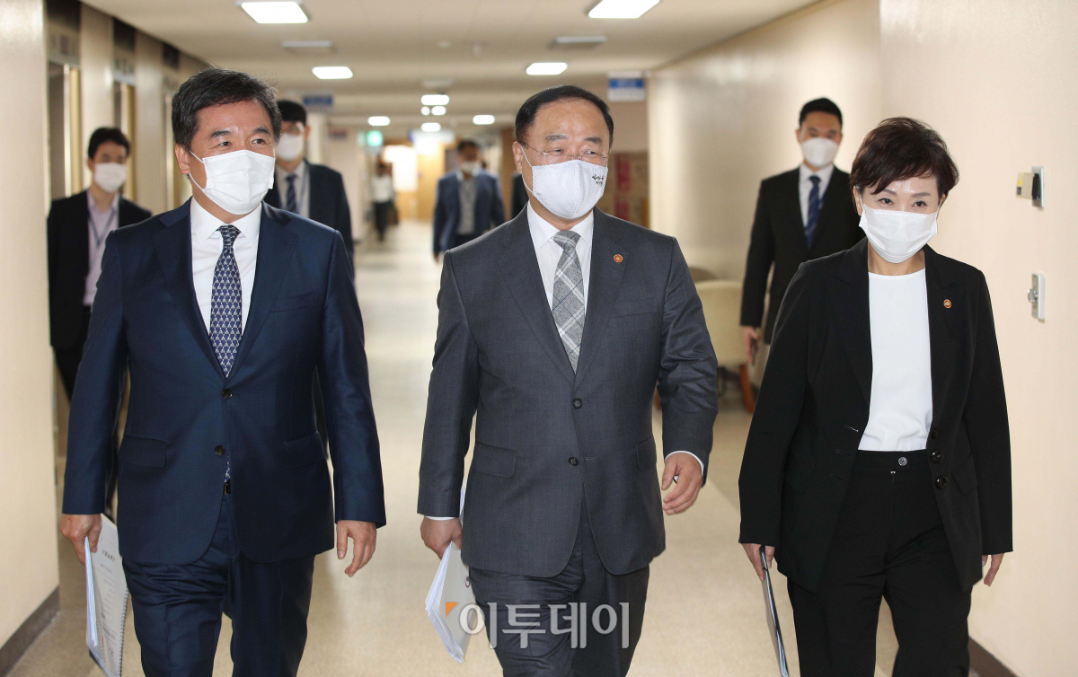홍남기(가운데) 부총리 겸 기획재정부 장관, 김현미(오른쪽) 국토교통부 장관, 서정협 서울시장 권한대행이 4일 서울 종로구 정부서울청사에서 서울권역 등 수도권 주택공급 확대방안을 발표하기 위해 브리핑룸으로 들어서고 있다.