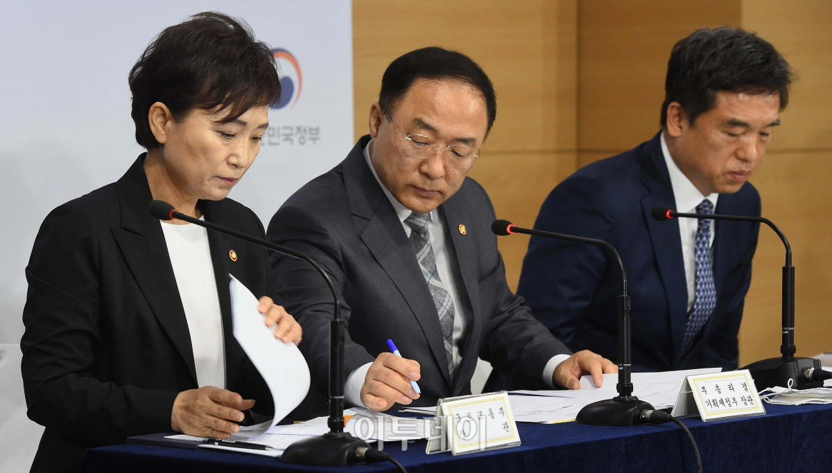 홍남기 부총리 겸 기획재정부 장관, 김현미 국토교통부 장관이 4일 서울 종로구 정부서울청사에서 열린 ‘주택공급확대 TF 회의결과 브리핑’에서 서울권역 등 수도권 주택공급 확대방안을 발표하며 자료를 살펴보고 있다.
