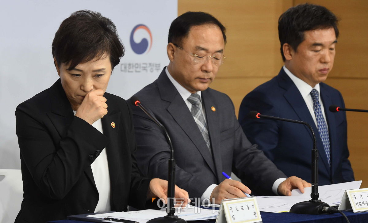 김현미 국토교통부 장관이 4일 서울 종로구 정부서울청사에서 열린 ‘주택공급확대 TF 회의결과 브리핑’에서 서울권역 등 수도권 주택공급 확대방안을 발표하던 중 잠시 얼굴을 만지고 있다.