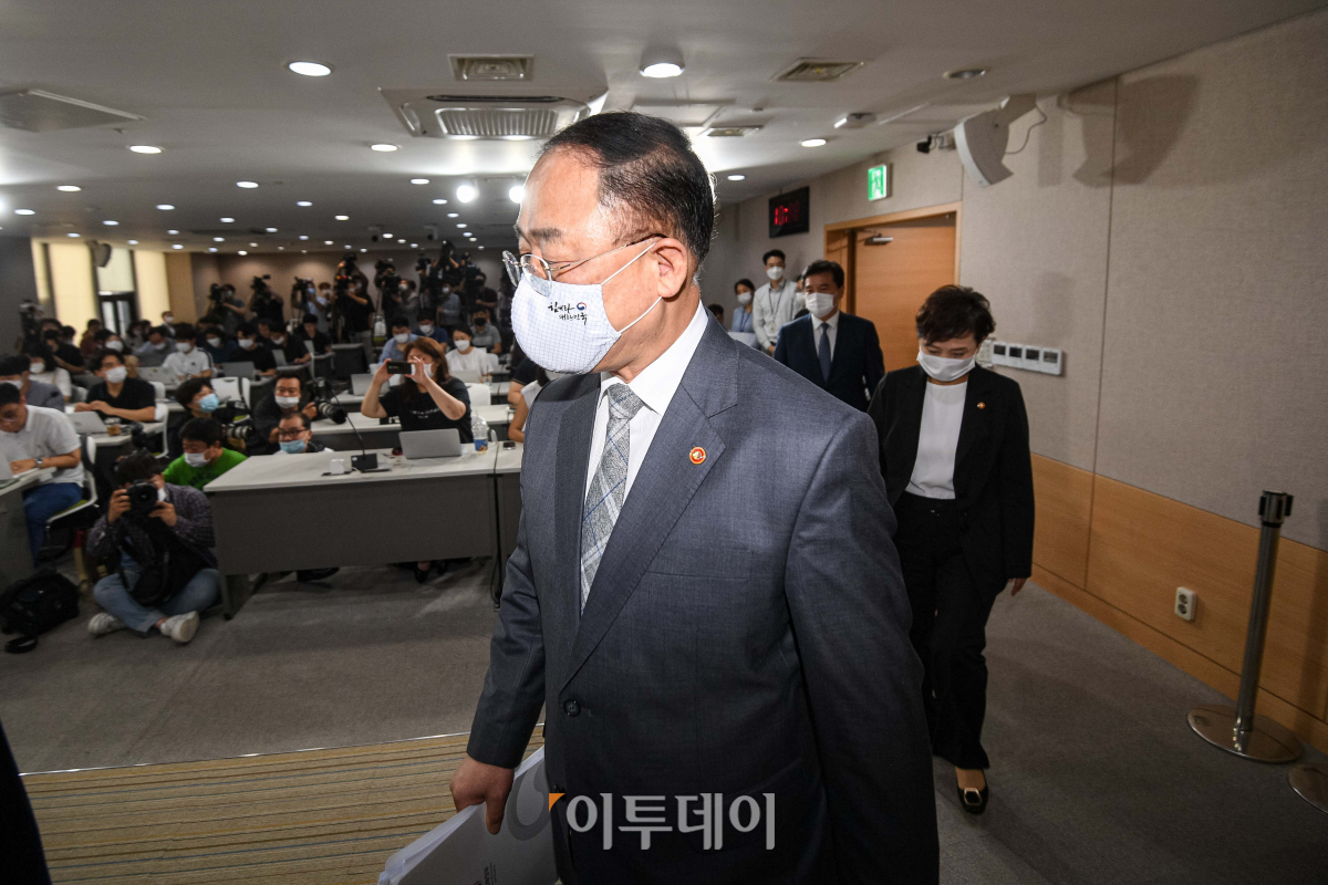 [포토] 브리핑룸 들어서는 홍남기 부총리