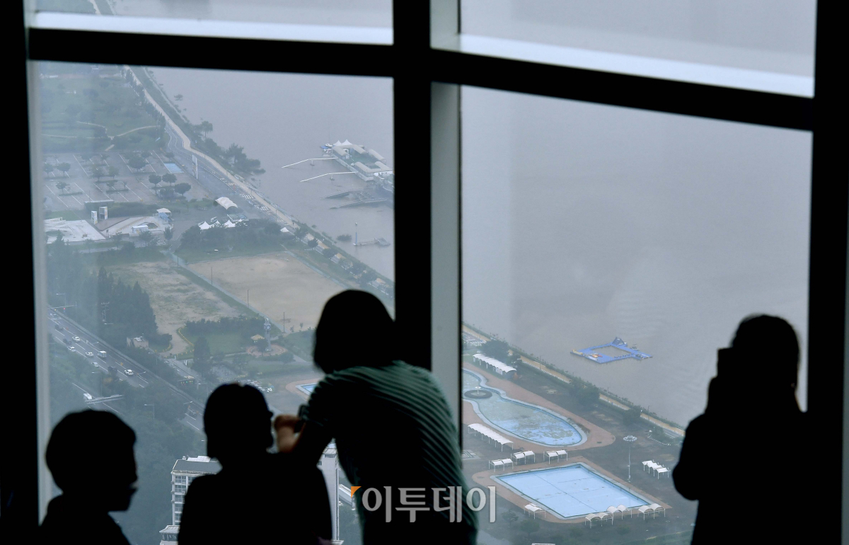 수도권 전역에 호우경보가 내린 5일 서울 송파구 롯데월드타워에서 바라본 한강에 흙탕물이 흐르고 있다.