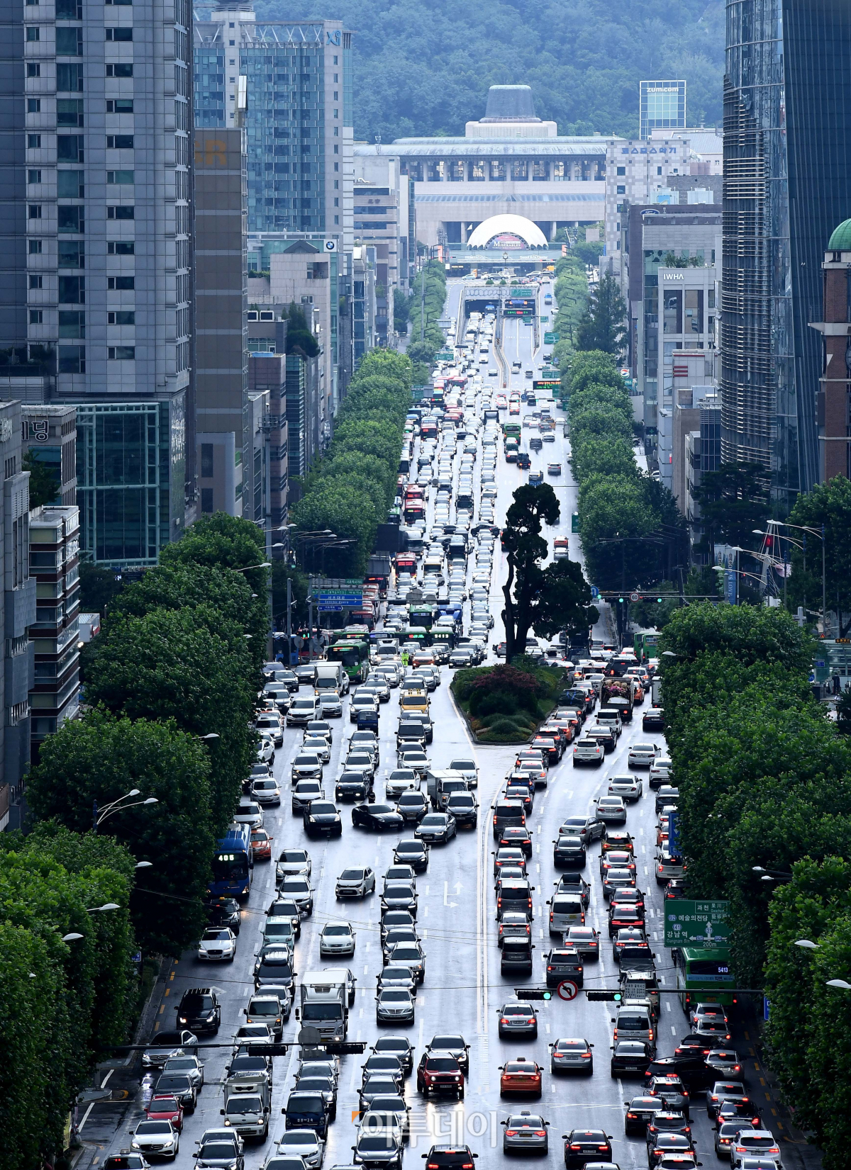 한강 수위가 상승하면서 서울 일부 지역에도 홍수주의보가 내려지고 주요 도로가 통제된 6일 오전 서울 반포대로 위의 차량들이 정체되고 있다.