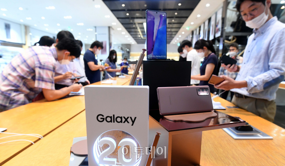 6일 서울 삼성전자 서초사옥 딜라이트샵에서 시민들이 갤럭시노트20 등을 살펴보고 있다. 삼성전자는 지난 5일 온라인 언팩을 통해 ‘갤럭시노트20’, ‘갤럭시Z 폴드2’, ‘갤럭시탭S7’, ‘갤럭시워치3’, ‘갤럭시 버즈 라이브’ 등 5종의 신제품을 공개했다.
