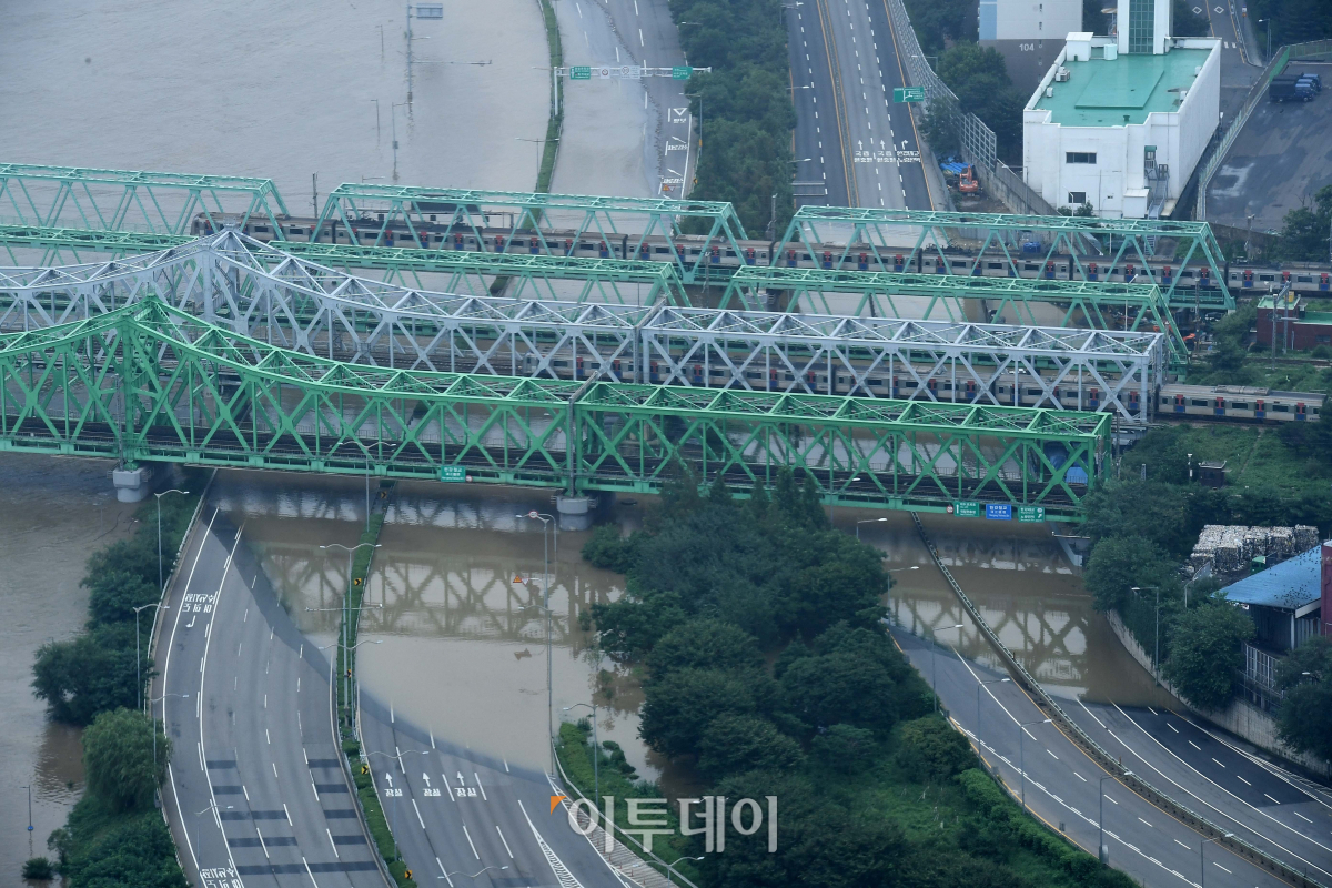 한강 수위가 상승하면서 서울 일부 지역에 홍수주의보가 내려지고 주요 도로가 통제된 6일 서울 여의도 63빌딩에서 바라본 올림픽대로와 노들길의 교통이 통제돼 있다.