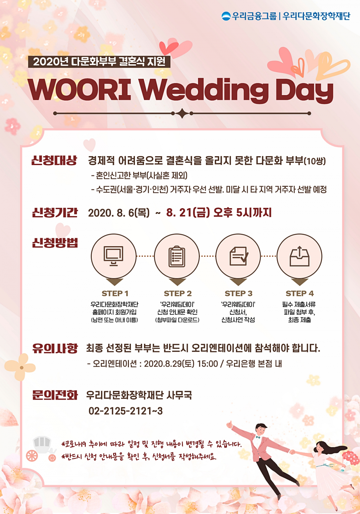 우리웨딩데이는 경제적인 어려움으로 결혼식을 올리지 못한 다문화 부부를 위한 결혼식을 지원하는 사업으로, 2013년부터 총 80쌍의 다문화 부부가 재단 지원을 통해 결혼식을 올렸다. 우리다문화장학재단 홈페이지를 통해 8월 21일까지 신청을 받으며, 신청사연과 소득수준, 부양가족 수 등을 고려해 총 10쌍의 부부를 선정할 예정이다.