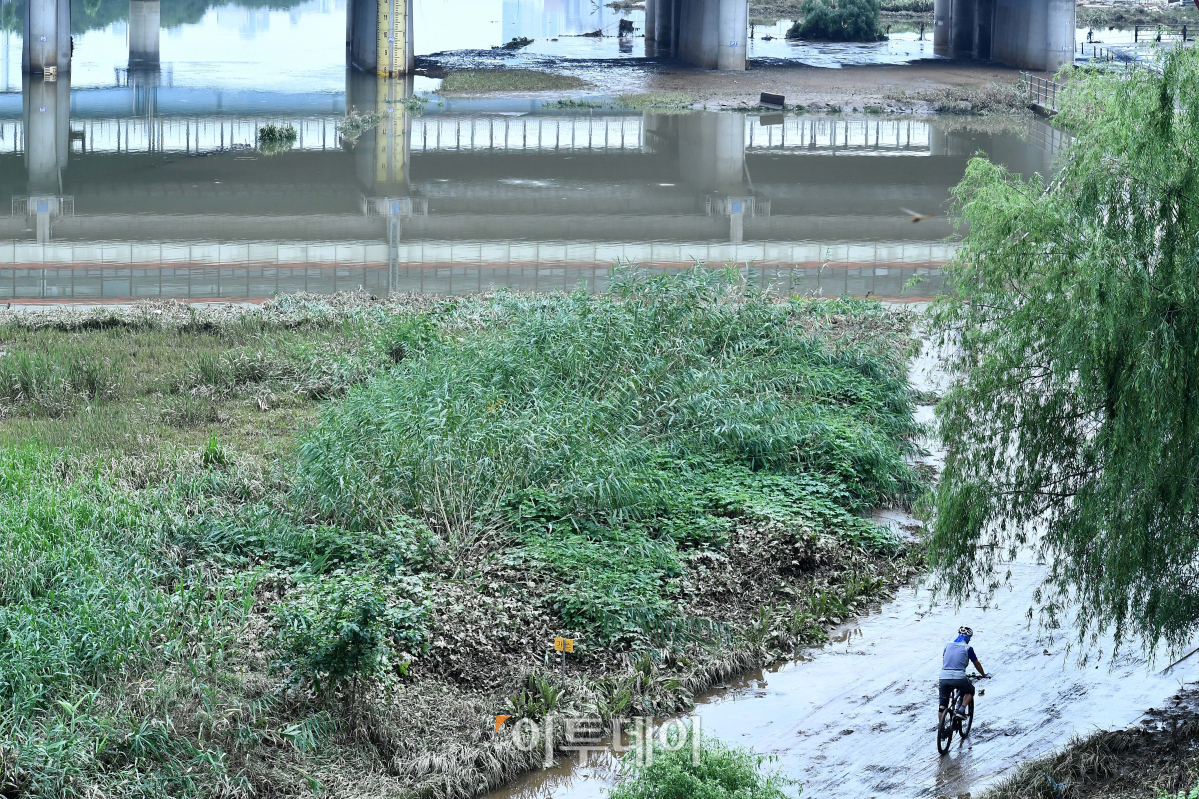 장마가 소강상태를 보이며 7일 한강과 서울 주요 하천의 수위가 낮아졌다. 안양천과 탄천, 중랑천 등 대부분 하천의 수위는 위험홍수위 아래로 떨어져 홍수주의보가 모두 해제됐다. 이날 서울 구로구 안양천변에서 한 시민이 자전거를 타고 있다.