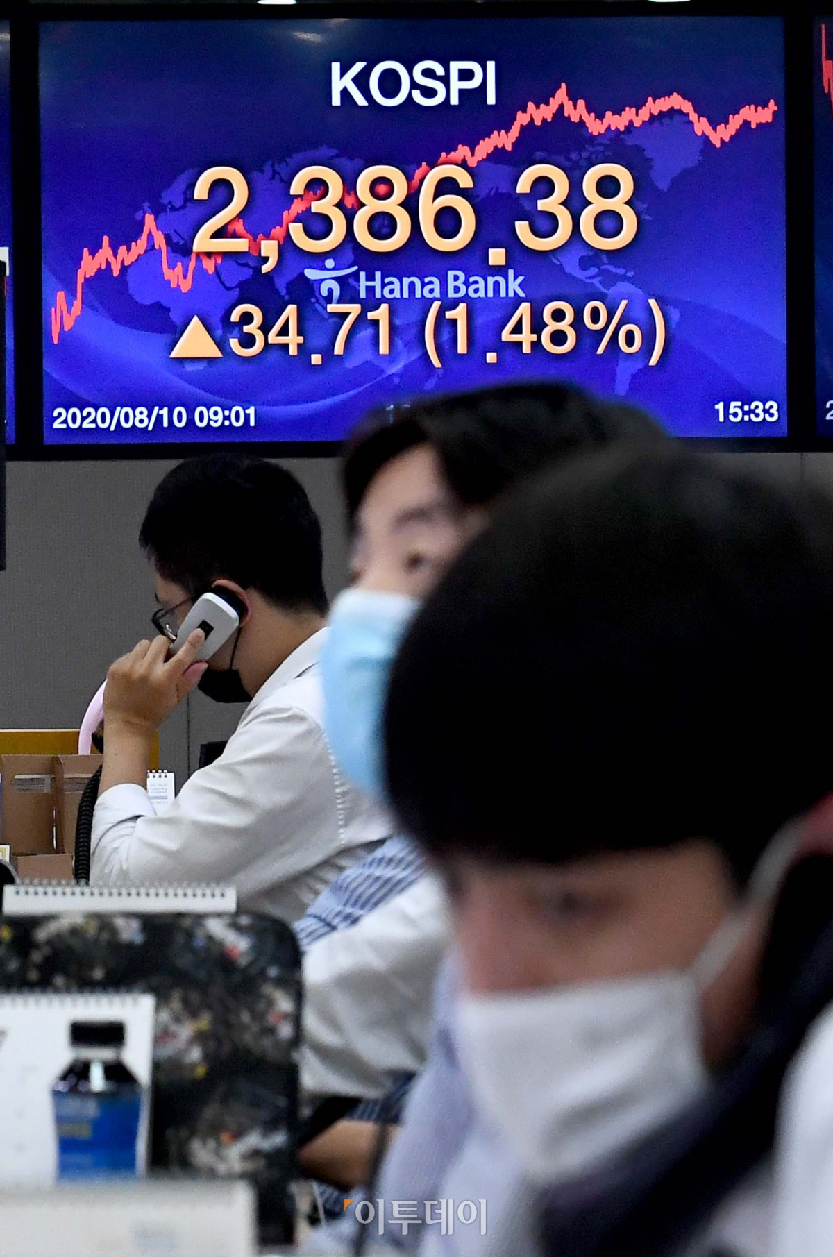 코스피가 6거래일 연속 상승하며 2380선을 돌파, 종가기준 연고점을 또 갈아치웠다. 10일 서울 중구 하나은행 딜링룸 전광판에 코스피가 전 거래일보다 34.71포인트(1.48%)오른 2386.38을 가리키고 있다.