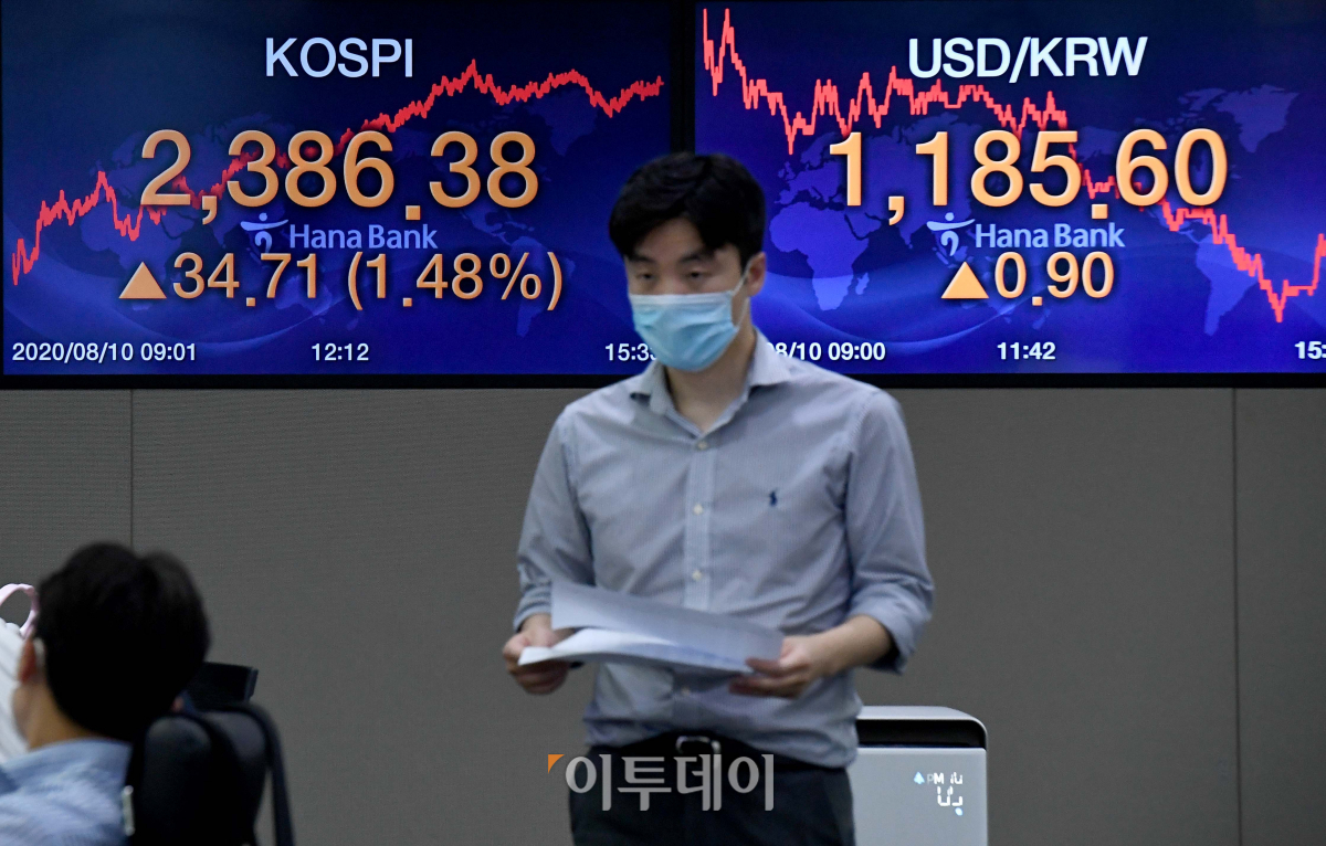 코스피가 6거래일 연속 상승하며 2380선을 돌파, 종가기준 연고점을 또 갈아치웠다. 10일 서울 중구 하나은행 딜링룸 전광판에 코스피가 전 거래일보다 34.71포인트(1.48%)오른 2386.38을 가리키고 있다.