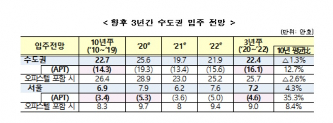 국토부는 2022년 이후에도 서울 아파트 입주 물량이 연간 5만가구 이상으로 예상되는 등 중장기적으로 공급이 충분한 상황이라고 덧붙였다.