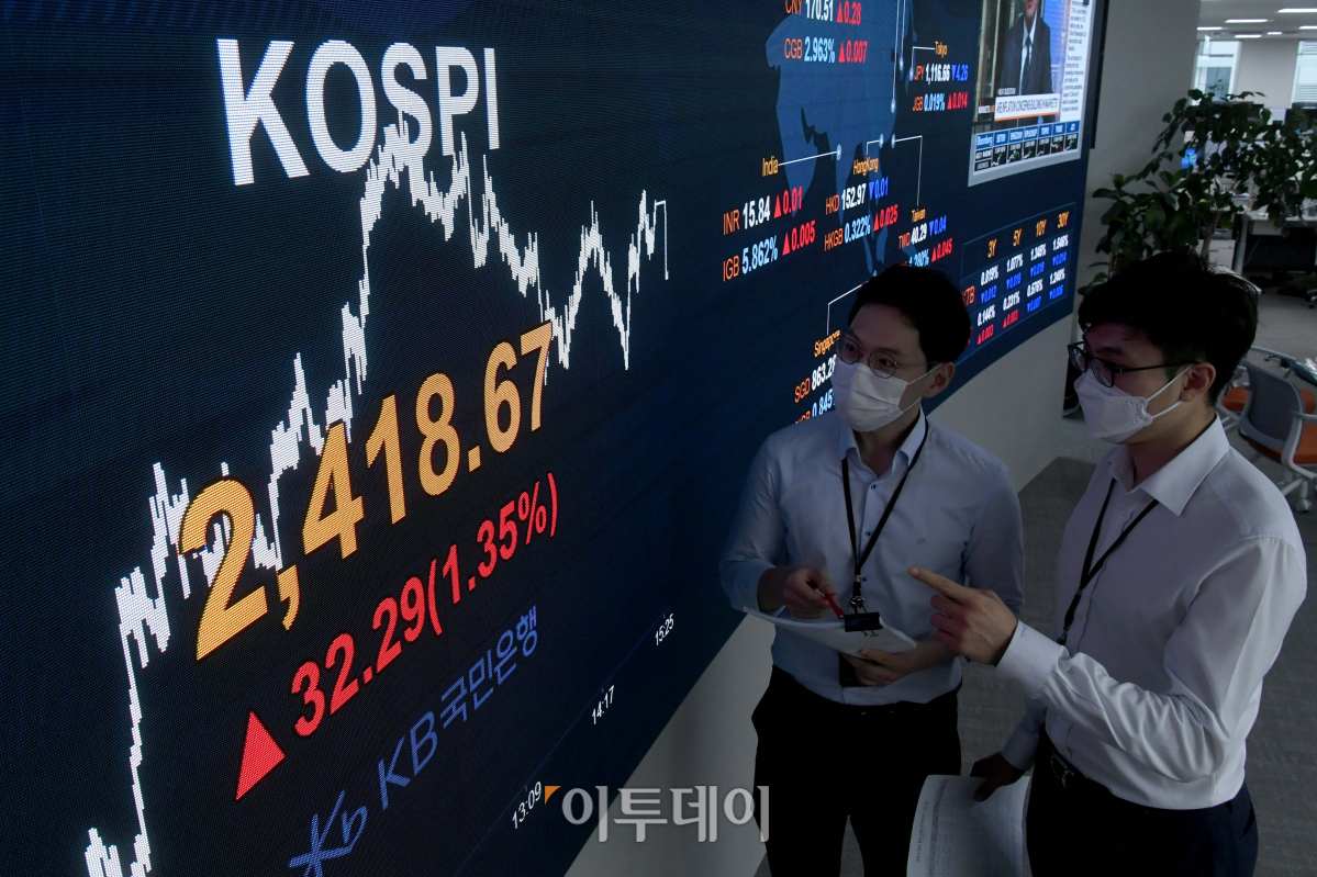코스피가 11일 2400선을 넘기며 장을 마쳤다. 종가 기준으로 2400을 넘은 건 2년 2개월(2018년 6월15일) 만이다. 이날 서울 여의도 KB국민은행 딜링룸 전광판에 코스피가 전 거래일보다 32.29포인트(1.35%)오른 2418.67을 가리키고 있다.