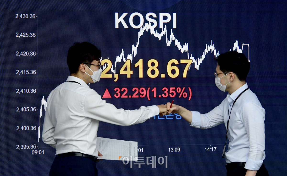 코스피가 11일 2400선을 넘기며 장을 마쳤다. 종가 기준으로 2400을 넘은 건 2년 2개월(2018년 6월15일) 만이다. 이날 서울 여의도 KB국민은행 딜링룸 전광판에 코스피가 전 거래일보다 32.29포인트(1.35%)오른 2418.67을 가리키고 있다.