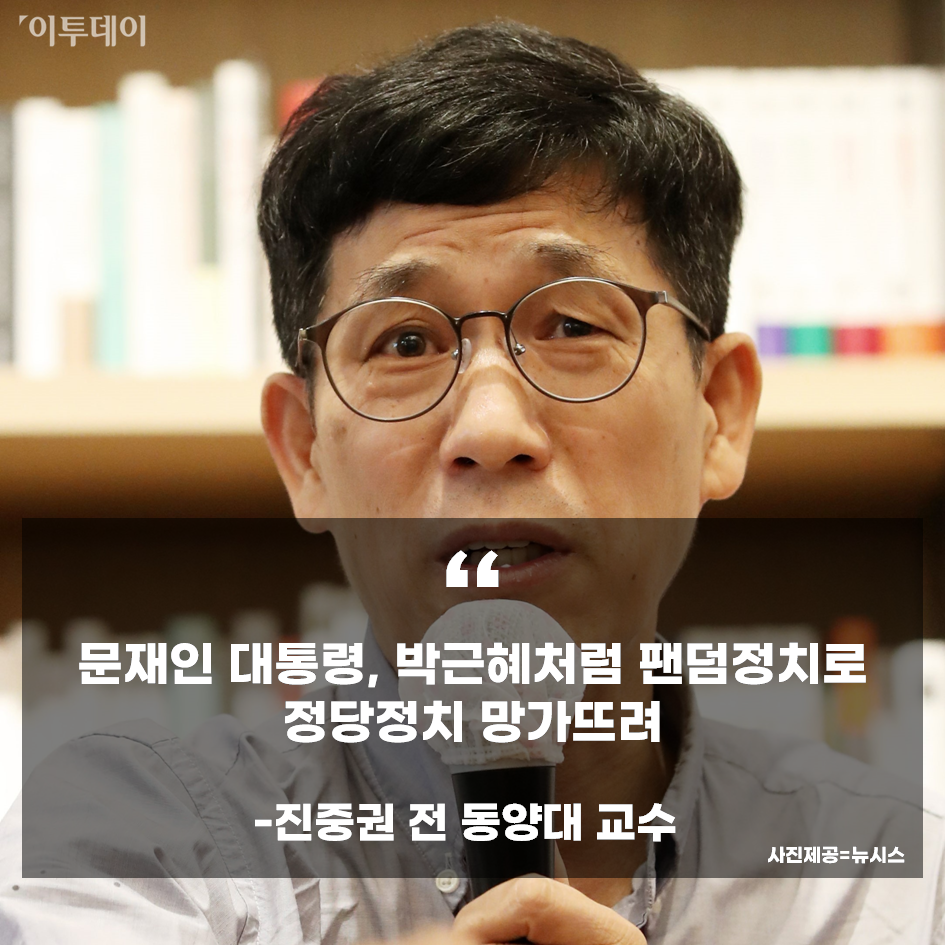 진중권 전 동양대 교수는 문재인 대통령과 박근혜 전 대통령의 공통점으로 ‘팬덤 정치’를 꼽으며 “그러다 보니 정당정치의 시스템이 망가진다”고 비판했습니다. 진중권 전 교수는 11일 페이스북에 올린 글에서 "박근혜는 아버지의 후광, 문재인은 친구의 후광. 둘의 공통점은 팬덤정치라는 데에 있다"며 "팬덤정치의 문제는 대의민주주의 절차를 건너뛰고 직접민주주의를 지향한다는 데에 있다. 자신들의 의지를 지도자가 직접 대변해 준다고 믿는다. 그러다 보니 정당정치의 시스템이 망가지는 것"이라고 주장했습니다.