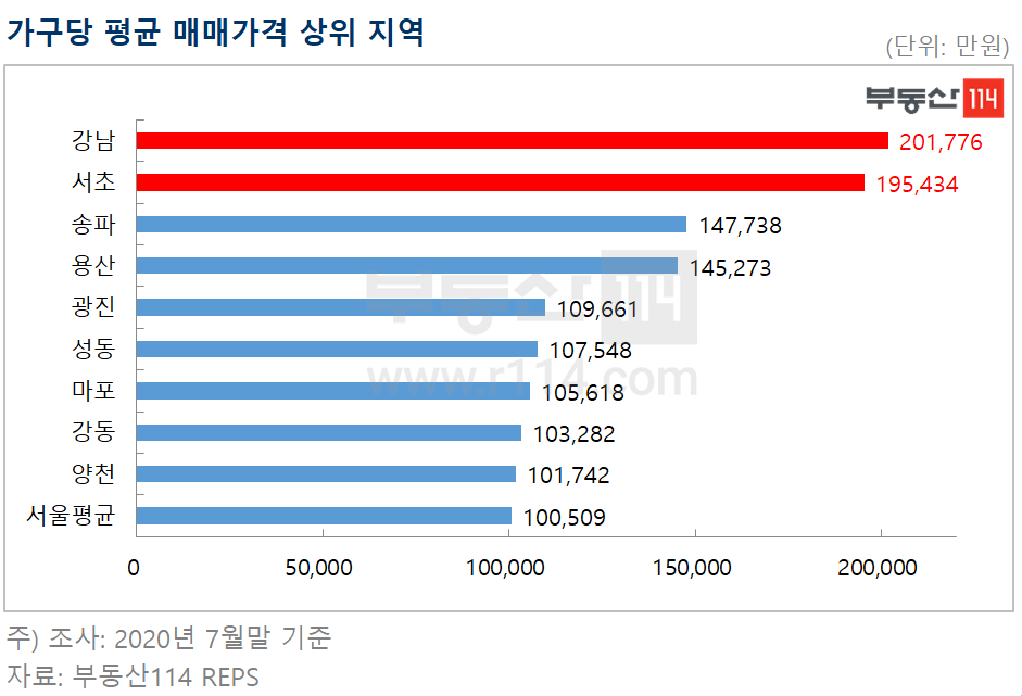 이 가운데 강남구(20억1776만 원)는 서울 자치구 중 처음으로 아파트값 20억 원 시대를 열었다. 그 뒤를 바짝 쫓고 있는 서초구(19억5434만 원)도 조만간 평균 매매가격이 20억 원을 넘길 기세다. 이 두 지역에선 2~3년 사이 재건축을 통해 구축아파트가 새 아파트 단지로 속속 탈바꿈하면서 서울 전체 아파트값 상승을 이끌고 있다는 게 부동산114 측 설명이다.