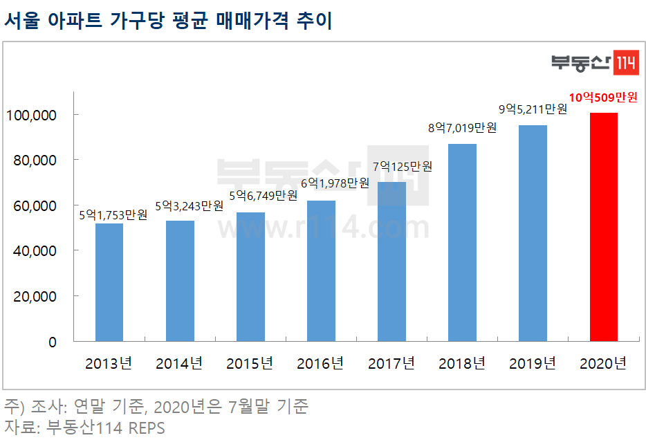 부동산 정보업체인 부동산114에 따르면 서울 아파트 평균 매매가격은 지난달 말 기준으로 10억509만 원에 이르렀다. 서울 아파트값이 평균 10억 원을 넘어선 건 이번이 처음이다. 지난해 말(9억5211만 원)과 비교해도 7개월 동안 5.6% 올랐다.