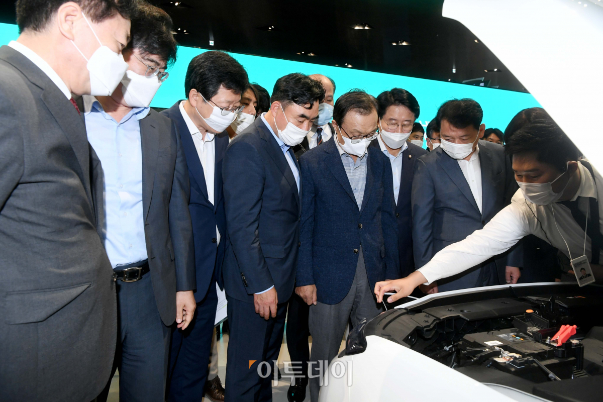 이해찬 더불어민주당 대표와 공영운 현대차 사장 등이 12일 경기 고양시 현대 모터스튜디오 고양에서 열린 ‘더불어민주당 K-뉴딜위원회, 미래차 현장간담회’에서 관계자에게 전기차 코나 일렉트릭에 대한 설명을 듣고 있다.