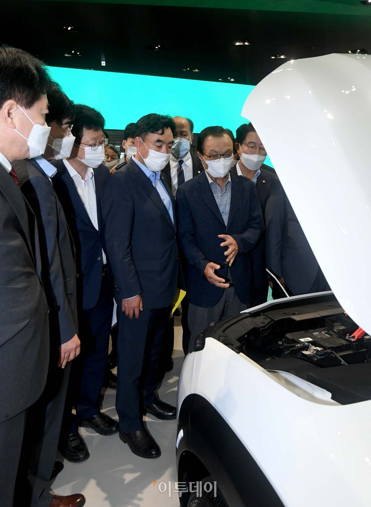 이해찬 더불어민주당 대표와 공영운 현대차 사장 등이 12일 경기 고양시 현대 모터스튜디오 고양에서 열린 ‘더불어민주당 K-뉴딜위원회, 미래차 현장간담회’에서 관계자에게 전기차 코나 일렉트릭에 대한 설명을 듣고 있다.